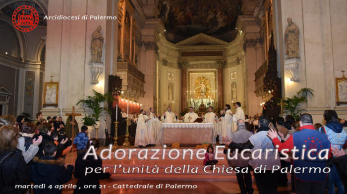 Martedì 4 aprile 2017, alle ore 21 in Cattedrale, avrà luogo un’Adorazione Eucaristica insieme all’Arcivescovo, mons. Corrado Lorefice. Si pregherà per l’unità della Chiesa di Palermo. Sonoinvitati i presbiteri e i diaconi, i religiosi e le religiose e tutti i fedeli laici.